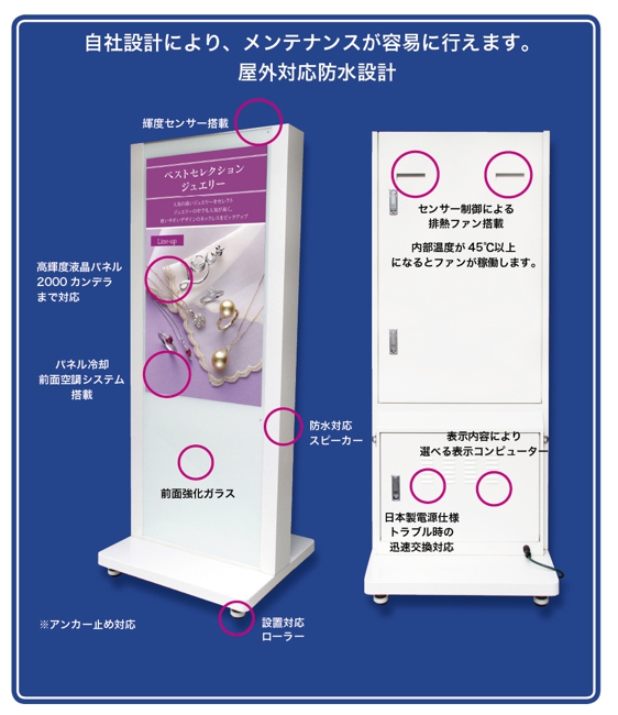 *屋外にも対応できる高輝度モニター、独自クーリングシステムで高温時のモニターブラックアウト現象への対応も万全です。